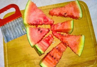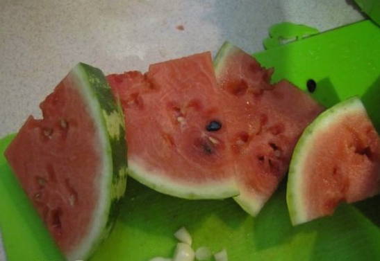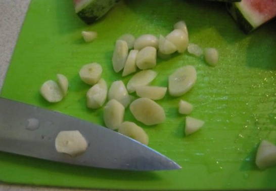 - Pel de knoflookteentjes. Snijd de gewassen watermeloen in middelgrote driehoeken.