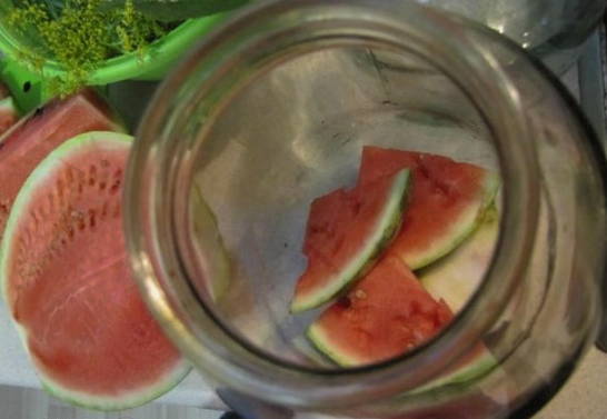 - We steriliseren de pot op elke handige manier. Leg hier de stukjes watermeloen stevig op.