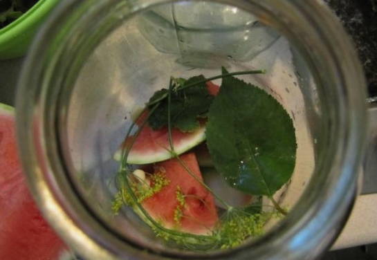 Doe de stukjes watermeloen stevig in een schone pot. Vul ze 20 minuten met kokend water.