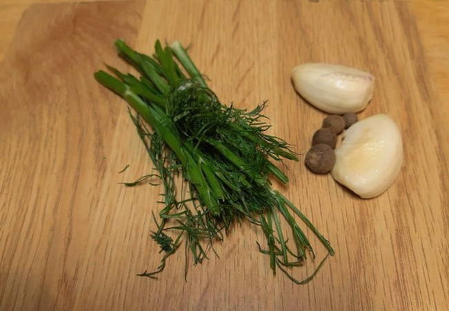 - We verspreiden het product in laagjes samen met stukjes knoflook, dilleparaplu's en bladeren.