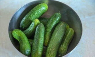 - Spoel de komkommers grondig af, snijd de staarten ervan af. Daarna laten we het product enkele uren in ijswater weken.