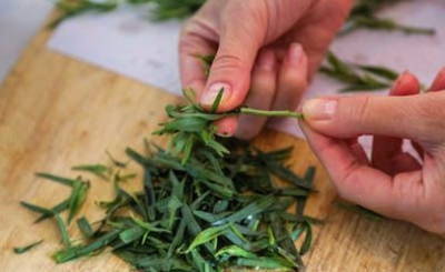 We wassen de takjes dragon en verwijderen de bladeren ervan. Alleen ze zijn nuttig voor het zouten.