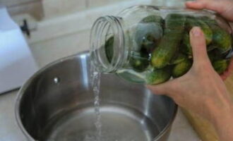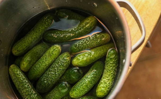 De exacte hoeveelheid water die je nodig hebt, bepaal je als volgt. We zetten de voorbereide komkommers en de pot en vullen ze volledig met water. Giet vervolgens de vloeistof in een pan.
