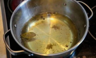 - Kook water voor de pekel. Roer er zout en suiker door. Voeg laurierblaadjes en zwarte peperkorrels toe, kook ongeveer 5 minuten.