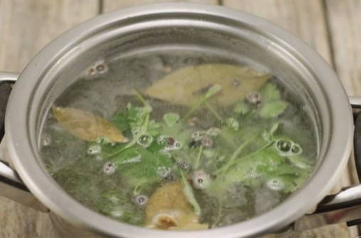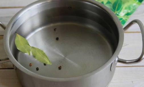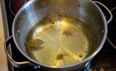 - Los zout op in koud water. Voeg hieraan laurierblaadjes en zwarte peperkorrels toe.