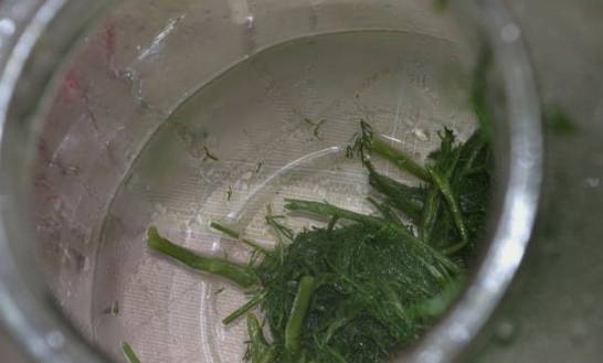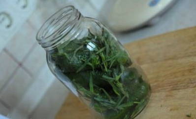 - We steriliseren de pot en doen de gehakte dille erin samen met de stelen.