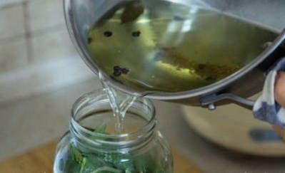 - Vul de inhoud van de potten met geurige hete pekel. We sluiten de container af met deksels en laten afkoelen op kamertemperatuur.