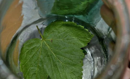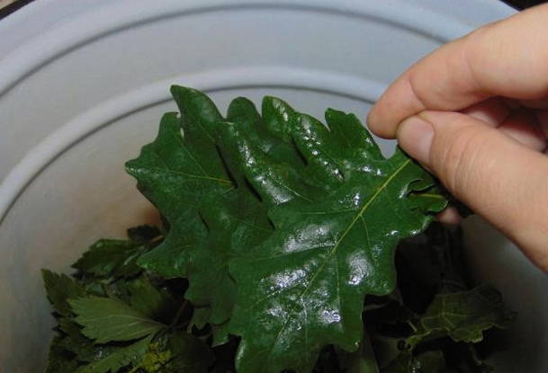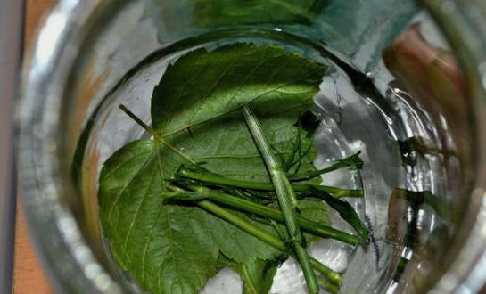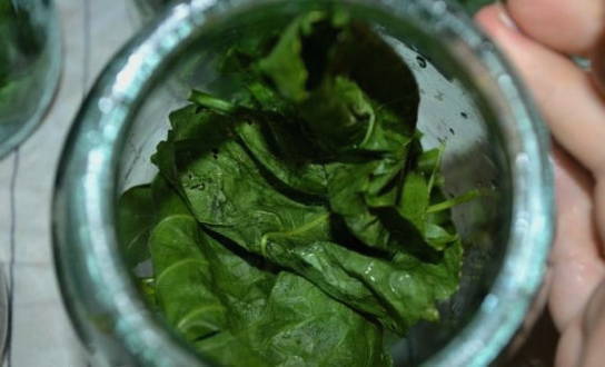 - We steriliseren de pot en doen de kersenbladeren erin.