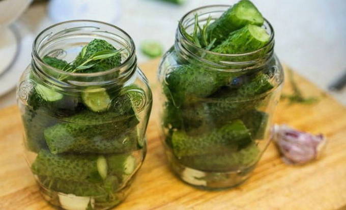 - We leggen schone geweekte komkommers in gesteriliseerde potten. We vullen ze aan met gewassen dragon en gepelde teentjes knoflook.