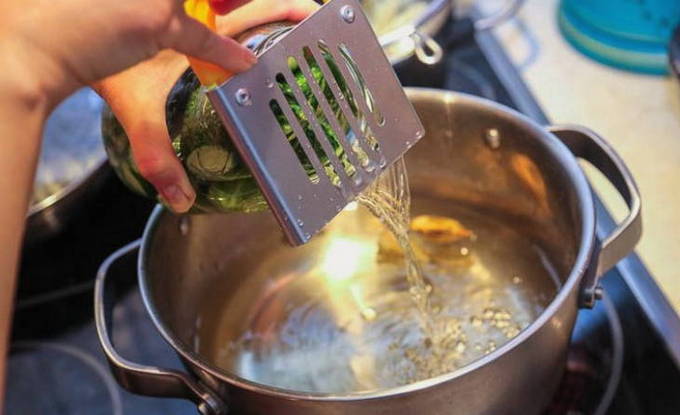 - Giet na een tijdje het water terug in de pan. Kook de pekel opnieuw en voeg er azijn aan toe. Zet het vuur uit.