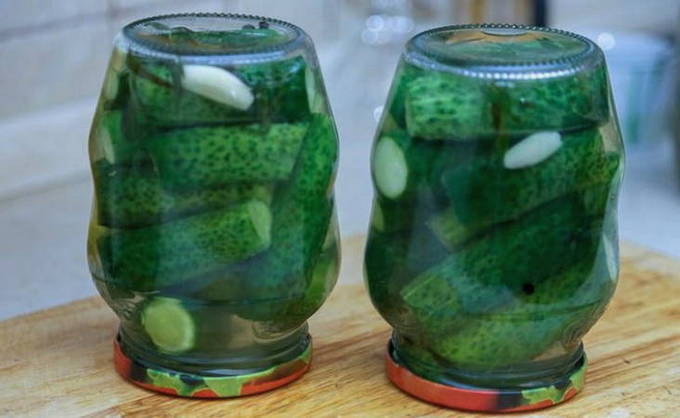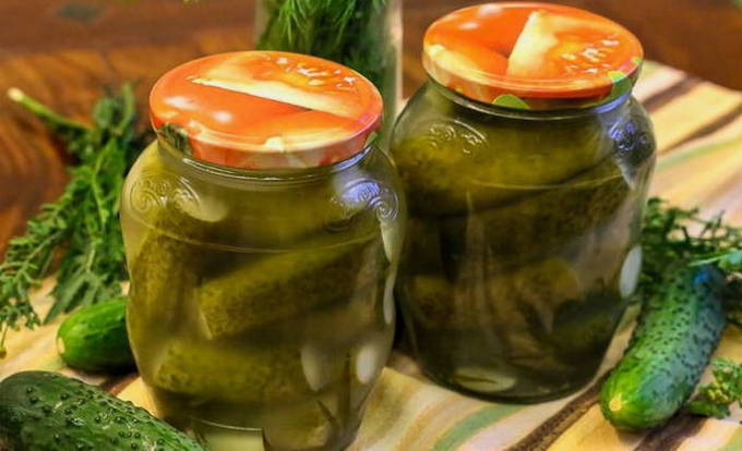 - Vul de komkommers met de voorbereide vloeistof. We sluiten de blanco's met deksels, draaien ze om en laten ze volledig afkoelen op kamertemperatuur.