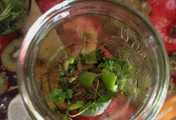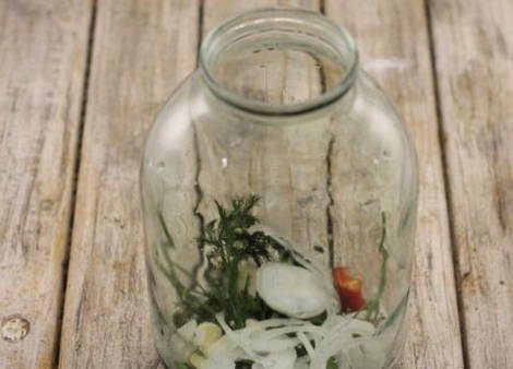- We wassen glazen potten met frisdrank. Doe knoflook, kersenbladeren, peterselie, stukjes paprika en chili op de bodem van de bak. Voeg ook de dillezaadjes toe.