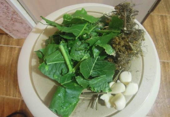 - Laten we de nodige kruiden bereiden. Pel de knoflook. De dilleparaplu's en mierikswortelbladeren wassen we onder water.