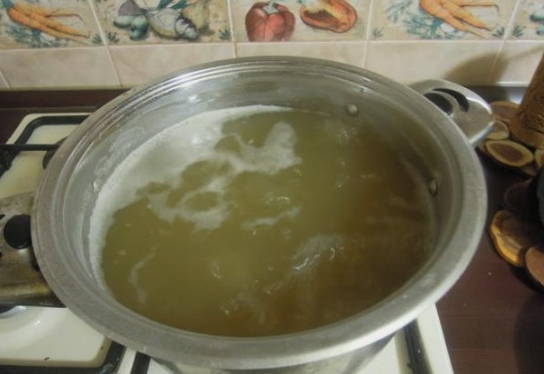 - Giet het water voorzichtig af in een pan. We koken het en roeren het met zout en suiker.