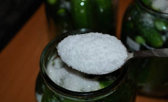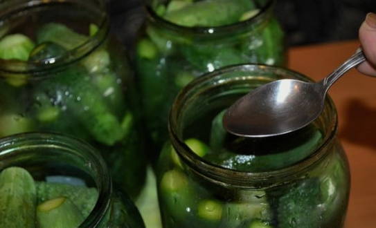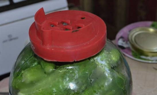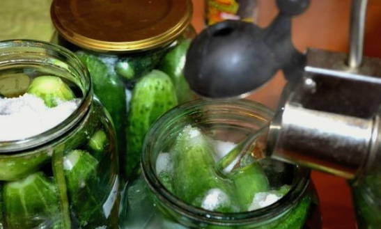 - Na een tijdje brengen we de komkommers over in schone en droge potten. We vullen ze met zout en vullen ze weer met koud water. We sluiten het werkstuk af met een gebroeid nylon deksel.
