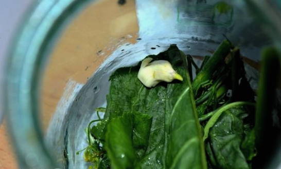 - Doe vervolgens fijngehakte knoflook en zout in een pot.