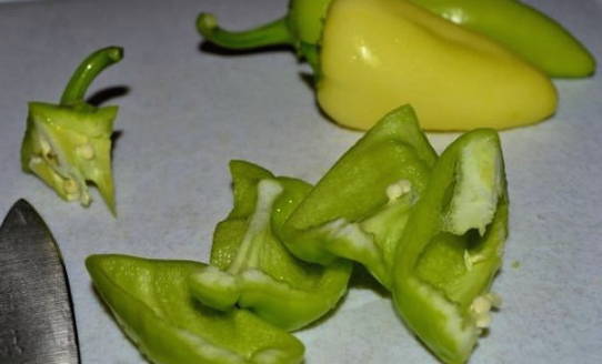 - We wassen de paprika's en verwijderen de steeltjes en het klokhuis ervan. We snijden het product zelf in kleine stukjes.