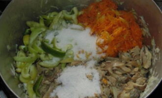 - We dompelen alle ingrediënten onder in een gewone pot plantaardige olie. Kook de inhoud, voeg zout en suiker toe en laat ongeveer 40 minuten sudderen. Giet gedurende 10 minuten in azijn.