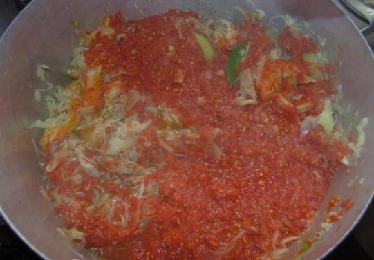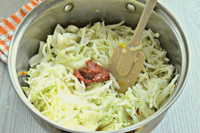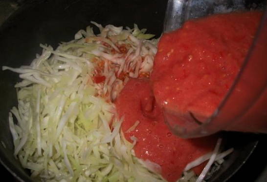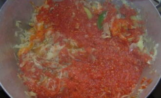- Voeg na een tijdje tomatenpuree en zout toe aan de massa. Roer en kook nog ongeveer 20-30 minuten.