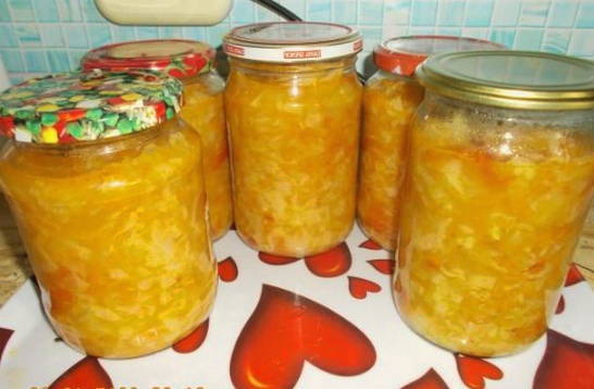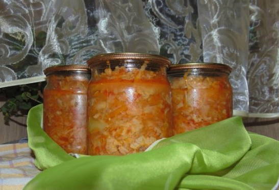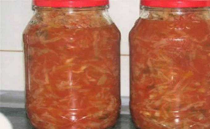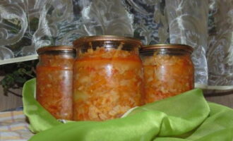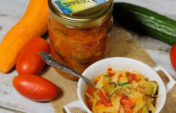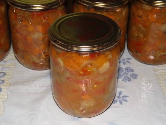 - Een smakelijke groente mengelmoes is klaar. Giet het in gesteriliseerde potten, koel het onder een deken en bewaar het op een koele plaats.