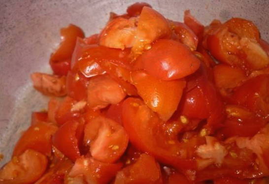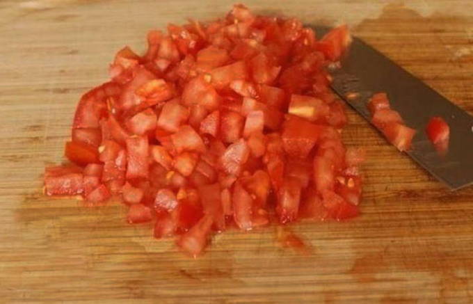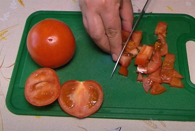 - Snijd de voorbereide tomaten in kleine stukjes.