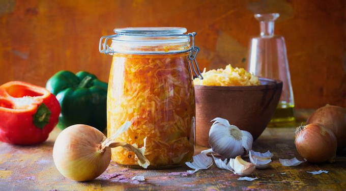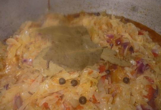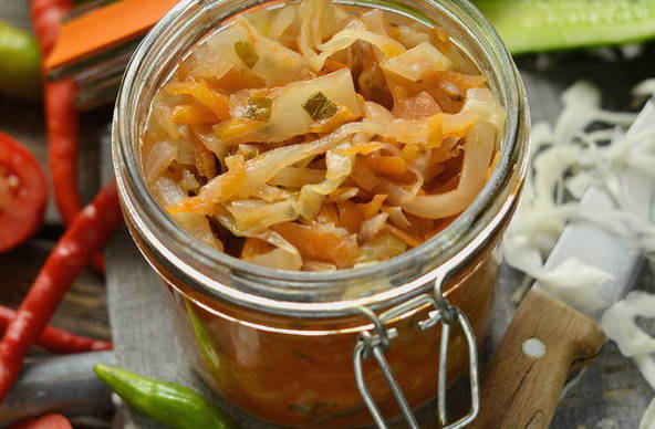 - We koken alle ingrediënten in een pan met plantaardige olie. Voeg na het koken zout en suiker toe en laat 30 minuten sudderen. Giet er aan het einde van het proces tafelazijn bij.