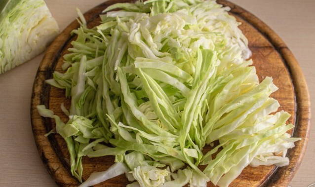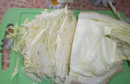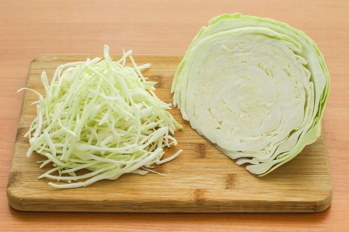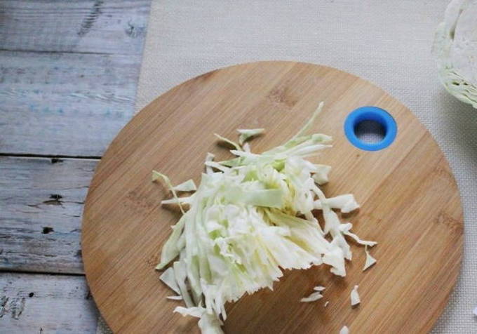 - We wassen de witte kool en verwijderen de bovenste bladeren ervan. Snijd vervolgens de koolkop fijn.