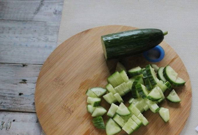 - Snijd de komkommers vervolgens in kleine stukjes.