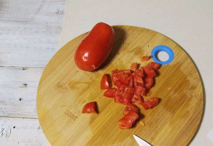 - Snijd de tomaten in kleine stukjes.
