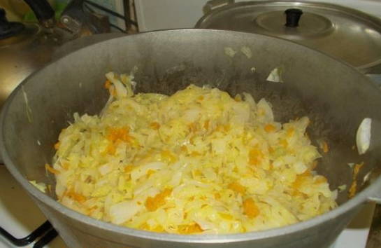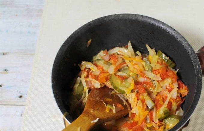 - Doe de groenten in een grote pan met boter. We sturen hier ook gesnipperde uien met wortelen. Zout de massa, bestrooi met kruiden en laat na 40 minuten koken sudderen.