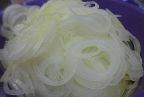 - Snijd de uien in dunne ringen.