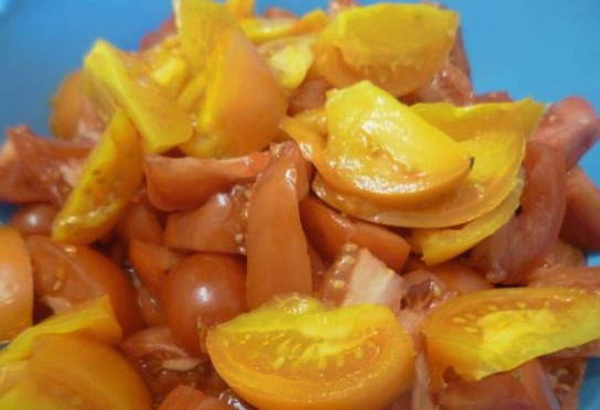 - Snijd de tomaten in kleine plakjes.