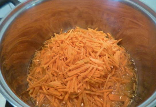 - Voeg vervolgens de geraspte wortelen toe, meng en laat ongeveer 15 minuten sudderen.