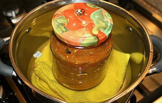 - Giet de afgewerkte traktatie in schone potten en steriliseer gedurende 20 minuten in een pan met water. We koelen het werkstuk en slaan het op.