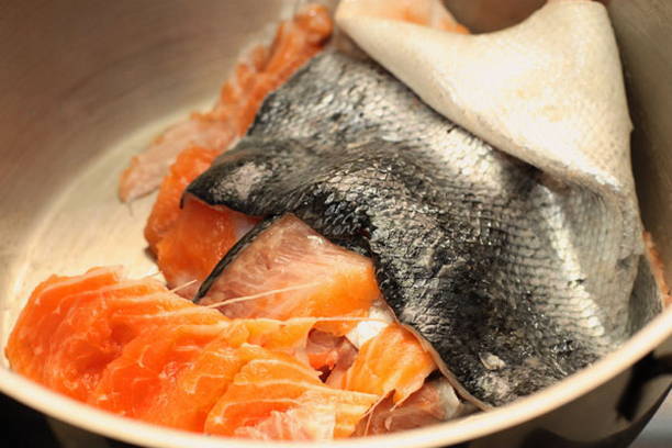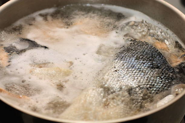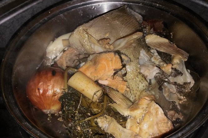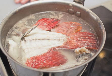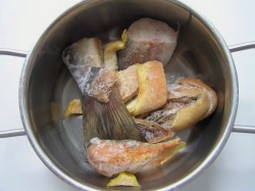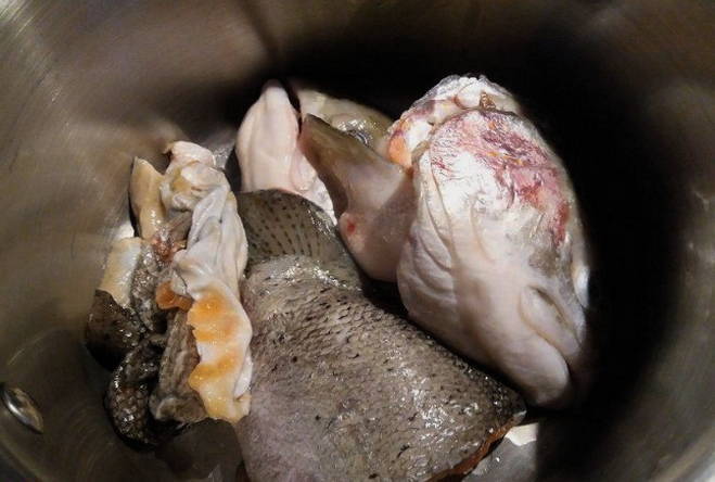 - We snijden verse vis. Plaats botten, koppen en staarten in een pan en vul met koud water.