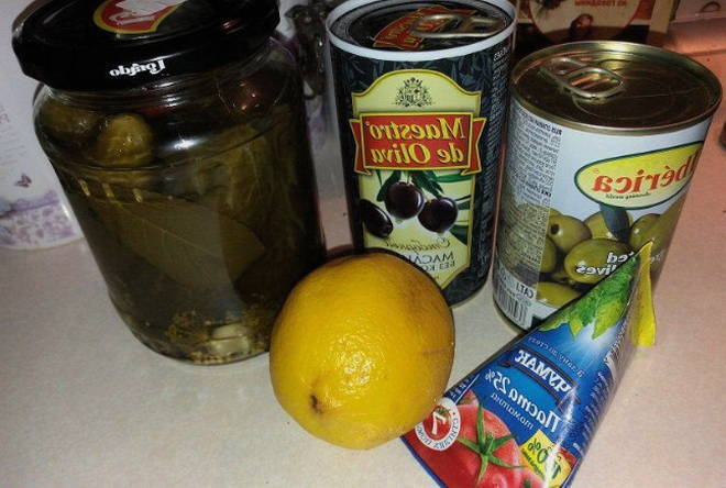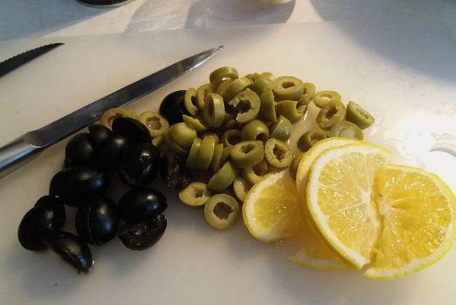 - Snijd de olijven en citroen.