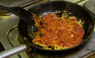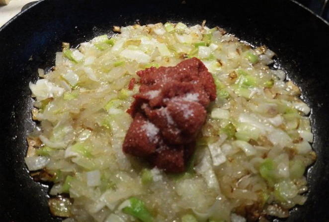 - Voeg tomatenpuree toe aan de gebakken uien. Zout naar smaak.
