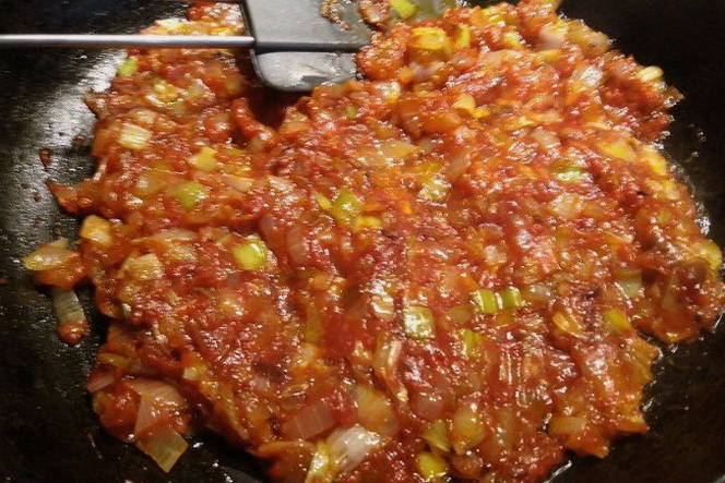 - Doe de tomatenpuree in de pan, meng alle ingrediënten en laat alles samen sudderen.