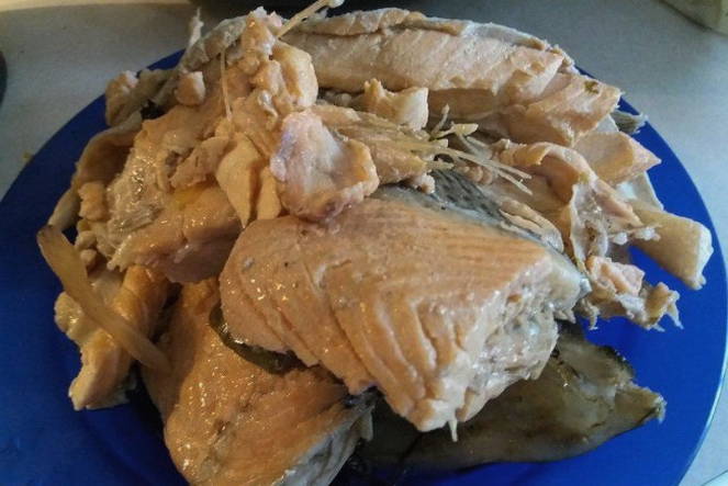 - Haal de vis uit de afgewerkte bouillon en scheid de filet van de botten. We verdelen het in stukjes.