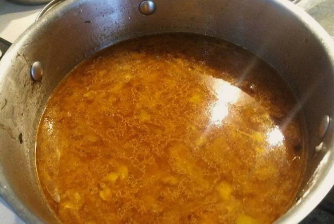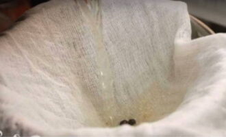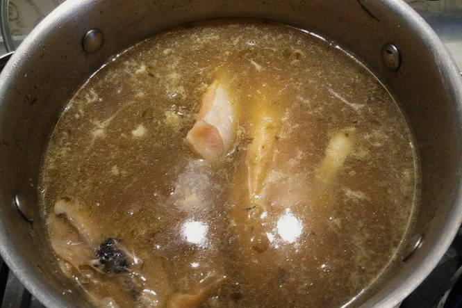 - Breng het water aan de kook en kook de bouillon, verwijder het schuim van het oppervlak. Zeef de bouillon en giet deze in een schone pan, waarin we hem opnieuw aan de kook brengen.