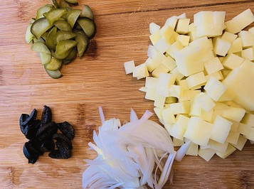 - Snijd de ui in reepjes. Snijd de aardappelen in blokjes en snijd de olijven in 4 stukken. Snijd de komkommers in halve ringen.