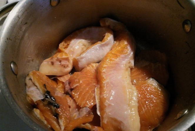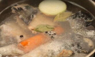 - We maken de vis schoon, doen hem in een pan en vullen hem met koud water. Kook de bouillon tot de vis gaar is. We halen het eruit en laten het afkoelen.