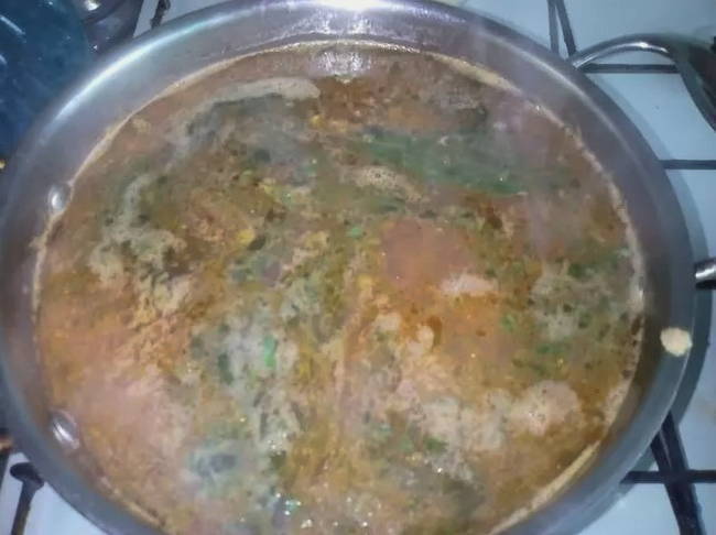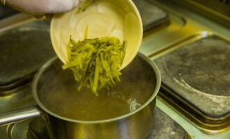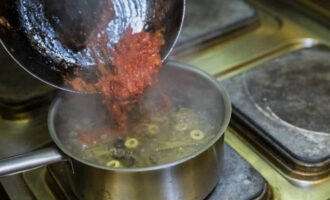 - Doe de gemene in de kokende bouillon. Voeg er ui met komkommer, kappertjes en laurier aan toe en breng alles aan de kook. Giet het vocht van de olijven bij de bouillon. Voeg greens toe aan de afgewerkte soep.