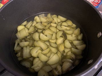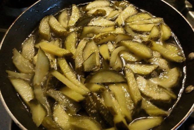 - Snijd de komkommers en kook ze in pekel.