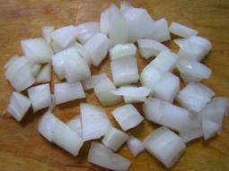 - Snijd de ui in blokjes en bak tot ze transparant zijn.