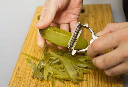 - Ook ingelegde komkommers snijden we in reepjes.