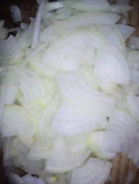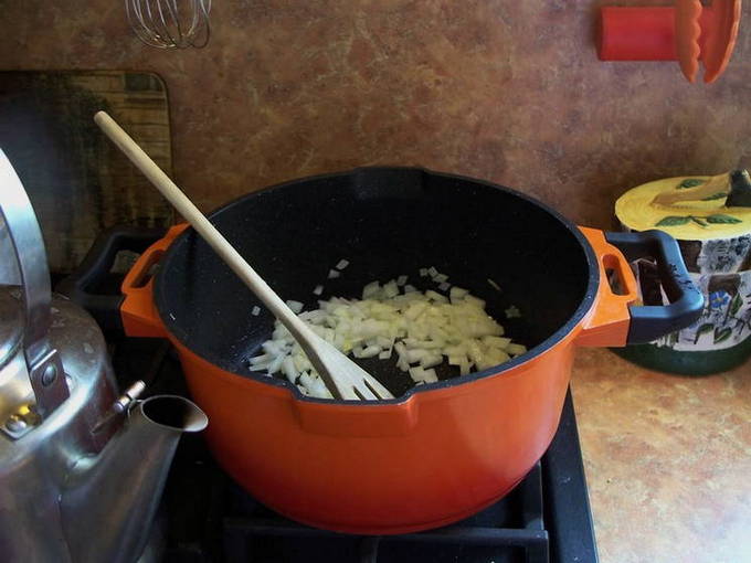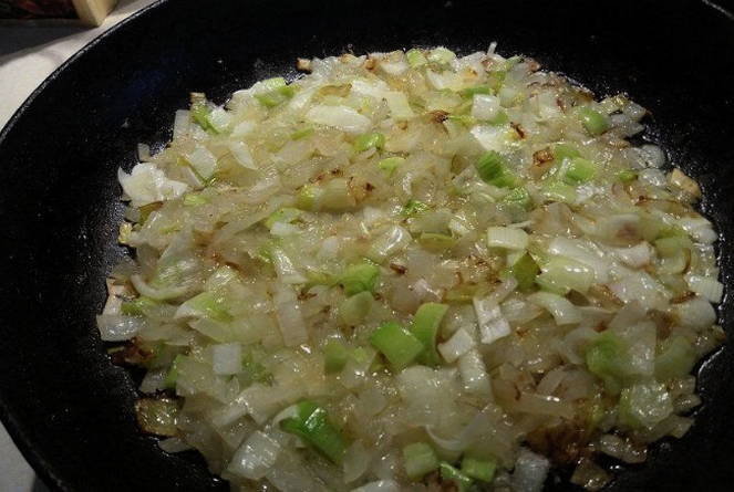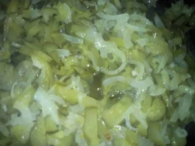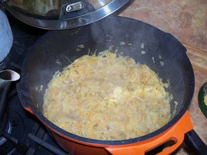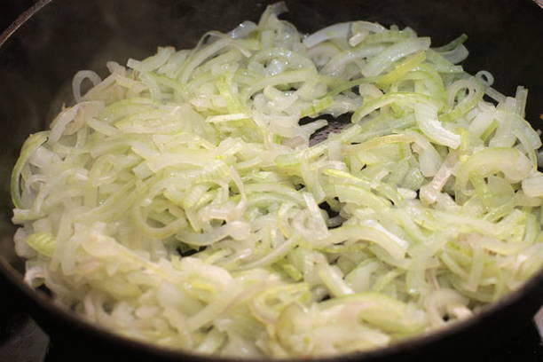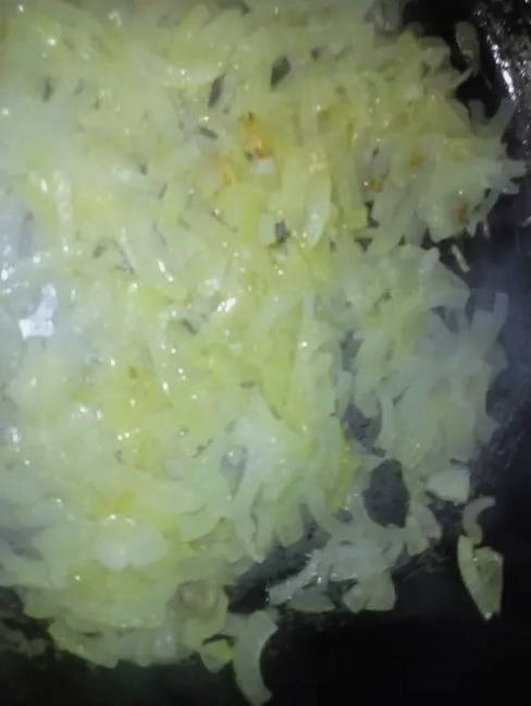- Giet plantaardige olie in een koekenpan en leg er uien op. Bak het goudbruin.