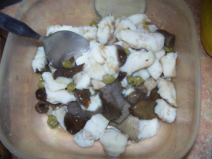 - Meng de gekookte vis in plakjes gesneden met kappertjes. Maal de ingelegde champignons en voeg ze toe aan de vis.
