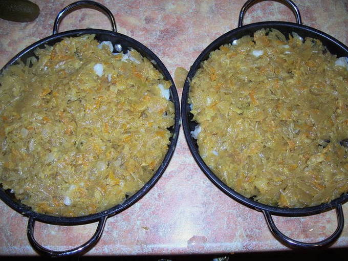 - Snipper de zuurkool en voeg deze toe aan de ui. We voegen ook bloem, zout, peper en suiker toe en laten een uur sudderen.