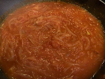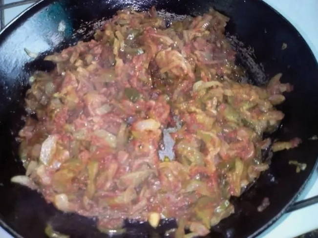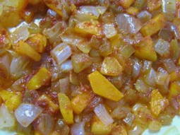 - Bak de uien in plantaardige olie tot ze goudbruin zijn. Voeg er tomaten en suiker aan toe. Laat alles samen sudderen tot de ui zacht is.